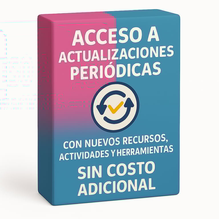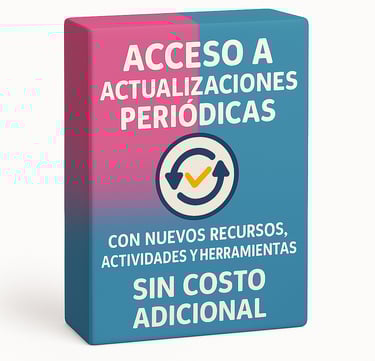 Acceso a actualizaciones periódicas con nuevos recursos, actividades y herramientas sin costo adicional, para que tu pack crezca con el tiempo y siempre tengas material fresco y listo para usar.